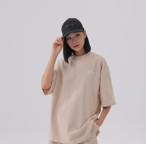 The cap features a sleek, structured six-panel design with a pre-curved brim that enhances the face shape while providing sun protection. A tonal embroidered patch on the front delivers a clean, modern aesthetic — subtle branding that speaks volumes.